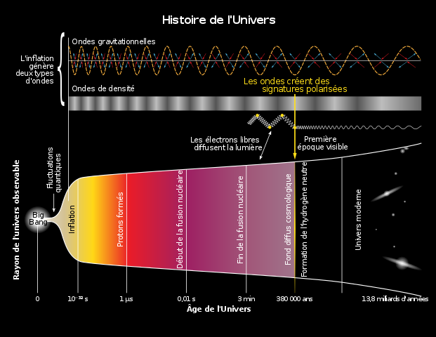 l y a environ 13,8 milliards d’années, toute la matière de l’Univers a ainsi émergé d’un seul point en une explosion violente. Celle-ci s’est développée à une vitesse et à une température incroyablement élevées, doublant de taille toutes les 10 à 34 secondes, créant ainsi de l’espace tout en gonflant rapidement. En une fraction de seconde, toutes les autres forces se sont formées. L’énergie s’est transformée en particules de matière et en antimatière, qui se sont en grande partie détruites.